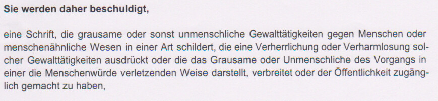 1. Der Staatsanwalt beschuldigt mich, grausame oder sonst unmenschliche Gewalttätigkeiten gegen Menschen oder menschenähnliche Wesen zu schildern