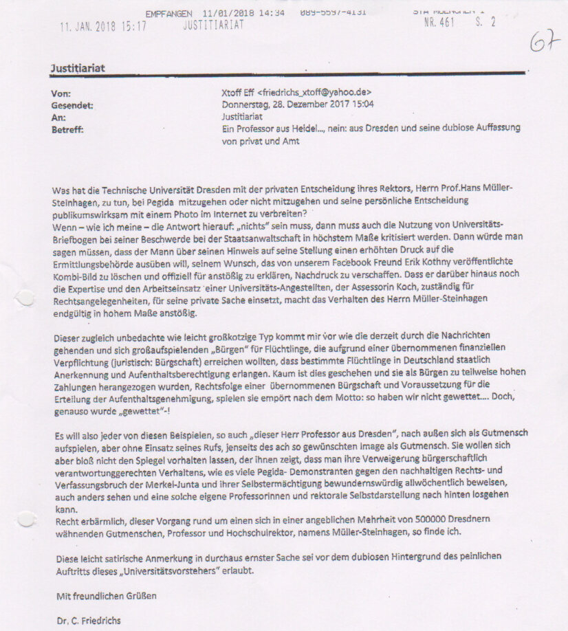 Der Rektor der TU Dresden Prof. Dr.Ing. habil. Hans Müller-Steinhagen hatte am 15.10.2015 folgenden dümmlich - naiven Post ins Internet gesetzt: