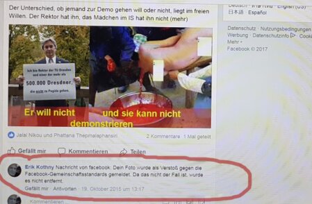 Nachdem der Rektor (oder sein Justitiar) vergeblich bei Facebook um Löschung gebeten hatte, wendete es sich mit einer "Bitte um Überprüfung" an die Staatsanwaltschaft Dresden. Er tat dies über die Rechtsabteilung seiner Uni.