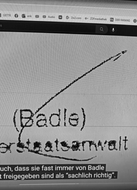 (Anmerkung: Die Aushebelung des Rechts durch einen Haken als Unterschrift scheint in der Justiz nicht unüblich, wie die Unterschrift von Oberstaatsanwalt Badle nahelegt. Badle ist ein wegen Korruption verurteilter Oberstaatsanwalt)