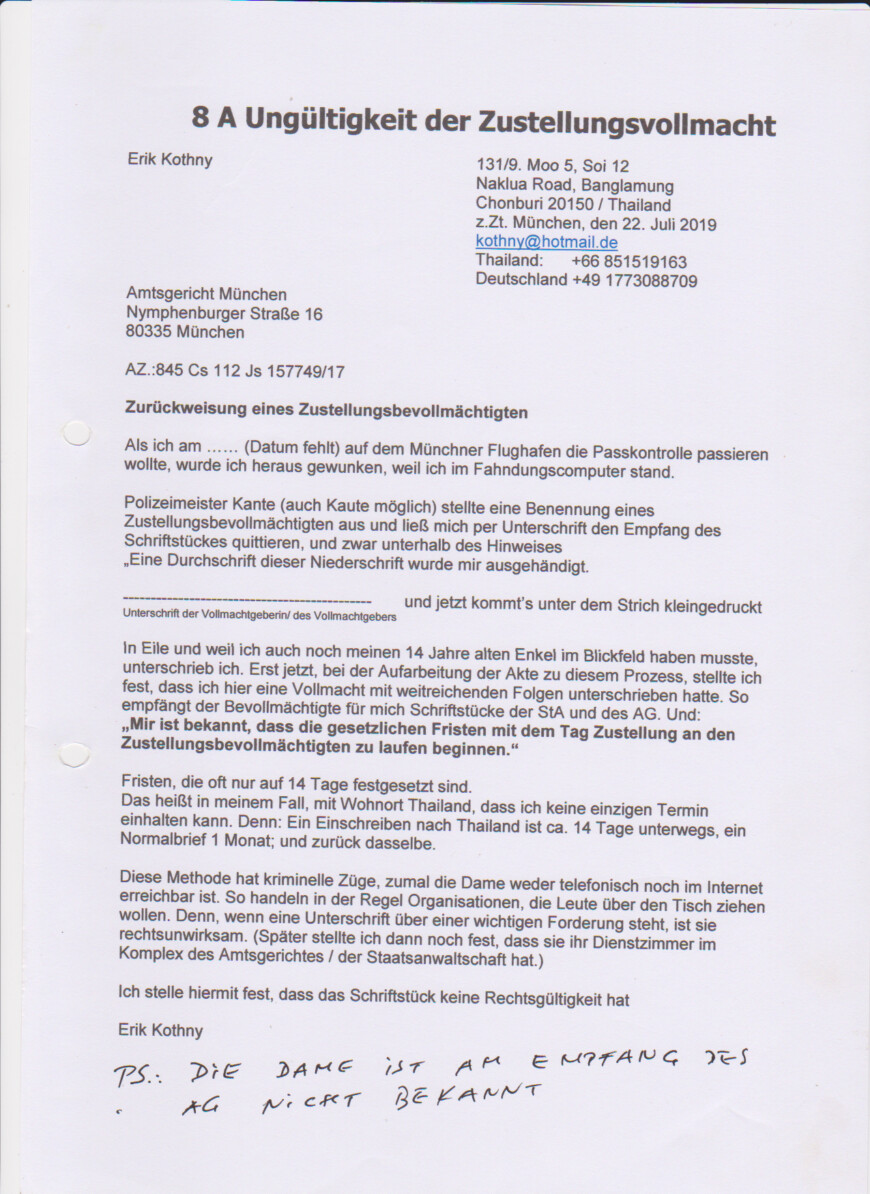 Polizeimeister K. stellte eine Benennung eines Zustellungsbevollmächtigten aus und ließ mich per Unterschrift den Empfang des Schriftstückes quittieren, und zwar unterhalb des Hinweises