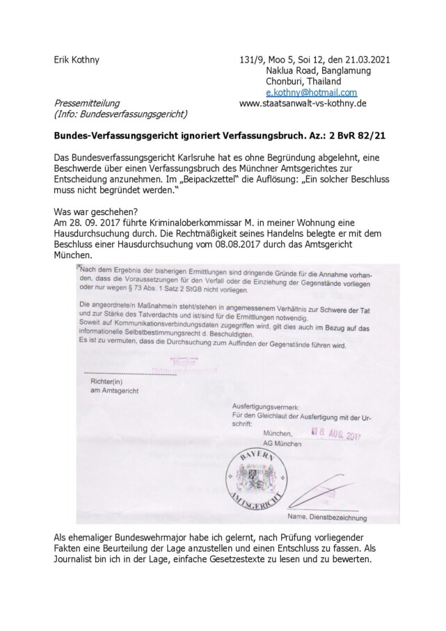 3. Eingerahmt wurde das Verfahren durch die Aushebelung der grundgesetzlich garantierten Unverletzlichkeit der Wohnung mittels eines durch einen Haken abgezeichneten Durchsuchungsbeschlusses vom 16. August 2017 und der Weigerung des Bundesverfassungsgerichtes, diese Rechtsbeugung mit einem undatierten Beschluss Anfang 2021 zu verhandeln.