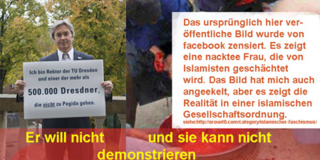 Wer aber zwischen Menschen muslimischen Glaubens und der Ideologie des Islams keine Trennungslinie zieht, der sollte eher zu einem Idiotentest geladen werden, als ich, der diese Trennungslinie zieht und in einem Bild aufzeigt, bis wohin diese Ideologie in der Lage ist zu gehen: Bis zur Schaechtung eines Menschen. Beispiele dafuer gibt es genug - und die moechte ich auch bis vor Gericht tragen koennen. Dann wird offensichtlich, dass ich Gewalt nicht verherrliche, wie der Staatsanwalt meint, sondern vor dieser Gewalt warne. Denn auch das, was der Rektor der TU Dresden mit seinem Pappschild von sich gibt, hat nichts mit Toleranz und Weltoffenheit zu tun, sondern mit Ausgrenzung einer demokratisch legitimierten Bewegung, in der Tausende von Buergern ihre Sorgen vor einer Ideologie artikulieren, die die Weltherrschaft zum Ziel hat. Dies manifestiert diese Ideologie in ihren Schriften. Doch die Elite hat offensichtlich verlernt zu lesen.