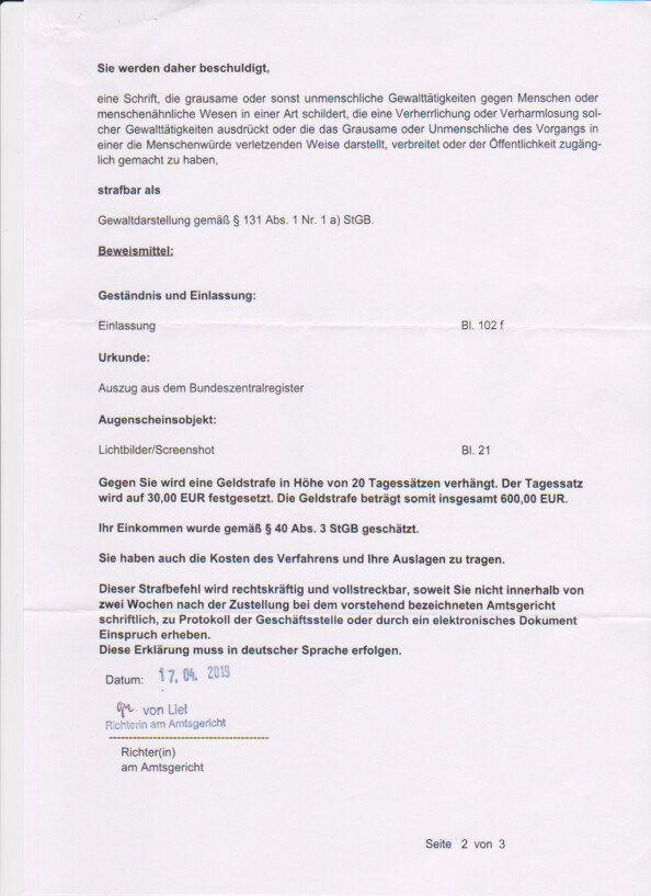 Von den vielfältigen Ermittlungen fand letztlich nur der Tatvorwurf "Gewaltdarstellung" Eingang in den Strafbefehl.